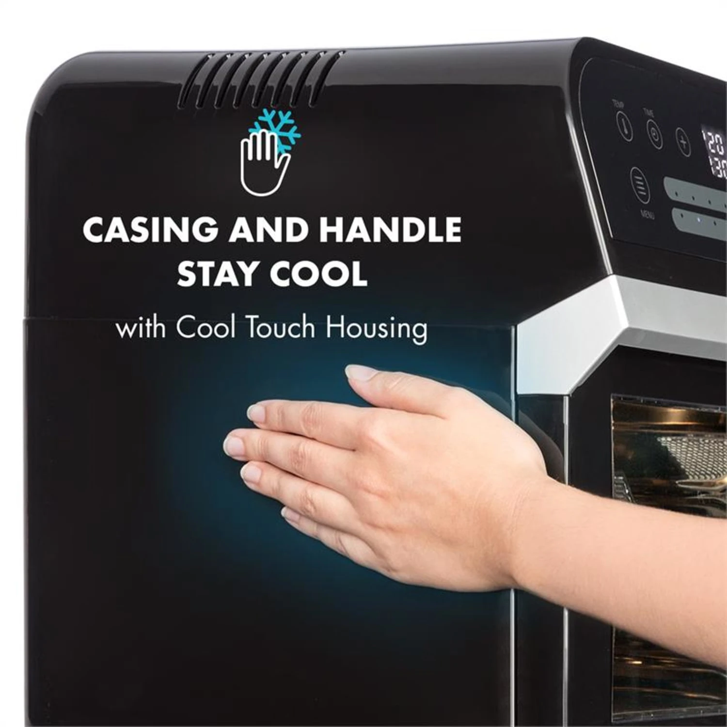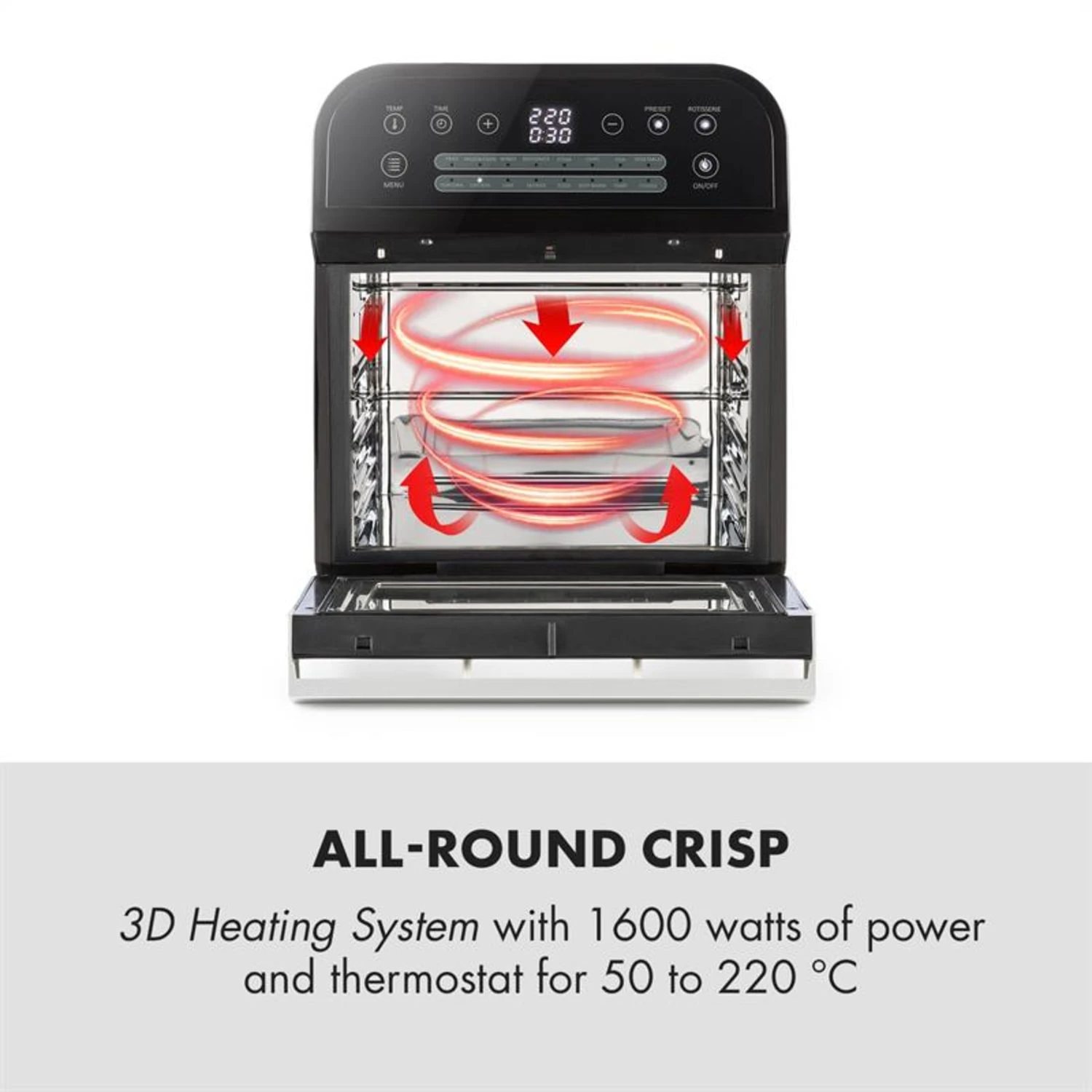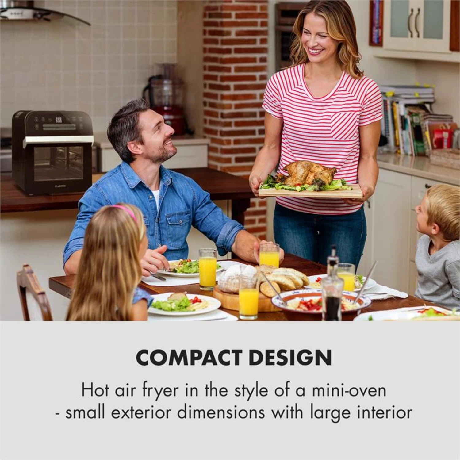 Der große XXL Innenraum lässt mit seinen gewaltigen 12 Litern Kapazität kaum Zubereitungswünsche offen und fasst sogar ein ganzes Grillhähnchen. Dabei ist die Klarstein AeroVital Cube Heißluftfritteuse dank ihres Mini-Backofen-Designs besonders kompakt und nimmt auf der Anrichte gerade einmal soviel Platz ein, wie eine herkömmliche Fritteuse! Das umfangreiche Zubehörset ist optimal auf alle nutzungszwecke eingerichtet: Eine Tropfwanne zum Auffangen von austretendem Fett, ein Grillrost und ein Grillkorb für großes und kleines Frittiergut wie ChickenWings oder Kroketten und ein Rotisseriespieß mit zugehörigem Drehspießheber gehören zum Lieferumfang. Und das beste ist: Hier kann man nach Lust und Laune frittieren, ohne sich um die Kalorien sorgen zu müssen, denn alles wird mit Heißluft völlig ohne Ölzugabe gegart.