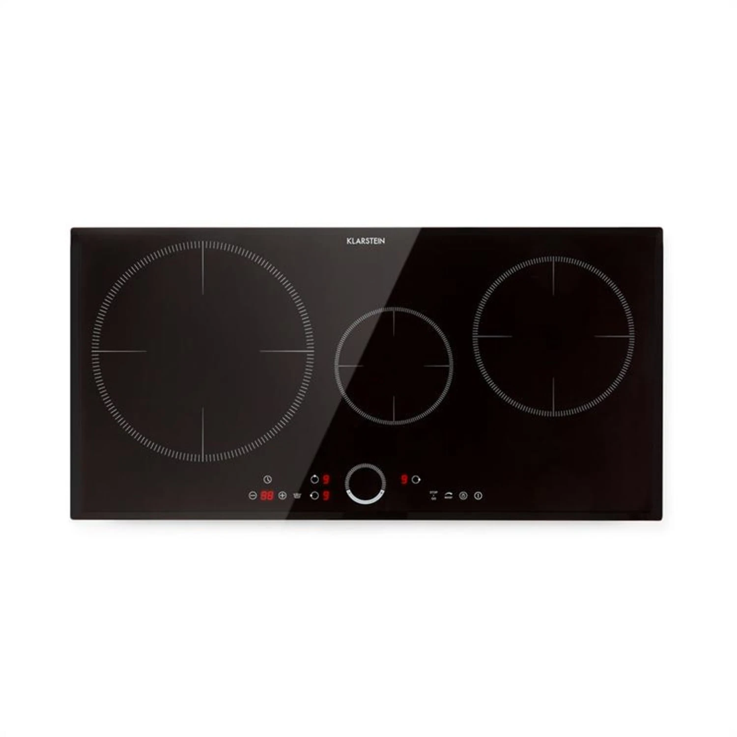 Drei Kochflächen für den Genuss bietet das Klarstein Delicatessa 80 Einbaukochfeld bei einer Gesamtleistung von max. 7400 W, die sich mit 2300 W, 2000 W und 1500 Watt auf die einzelnen Kochflächen verteilen und die Inhalte von Töpfen und Pfannen in Spitzenzeiten zum Kochen bringen. Dabei ist die linke Kochzone mit einem Durchmesser von 30 cm besonders groß – perfekt zum Beispiel für Paella-Pfannen oder den Einkochtopf. Alle Felder lassen sich separat in ihrer Leistung regeln und verfügen über eine ThermoBoost-Funktion, mit der die Leistung zum schnellen Erhitzen nochmals auf bis zu 3000 W gesteigert wird. Bedient wird das Klarstein Delicatessa 80 Glaskeramik-Kochfeld unkompliziert mit einem integrierten SenseControl Touch-Panel mit Touch-to-slide-Regler zur Leistungskontrolle und Digitaldisplay. So durchbrechen weder Knöpfe noch Regler die Oberfläche der Küchenzeile. Neben der Leistung kann für jedes Kochfeld ein bis zu 99-minütiger Timer programmiert werden, der entweder nach Ablauf der eingestellten Zeit die Kochplatte abschaltet oder ein akustisches Signal ertönen lässt.