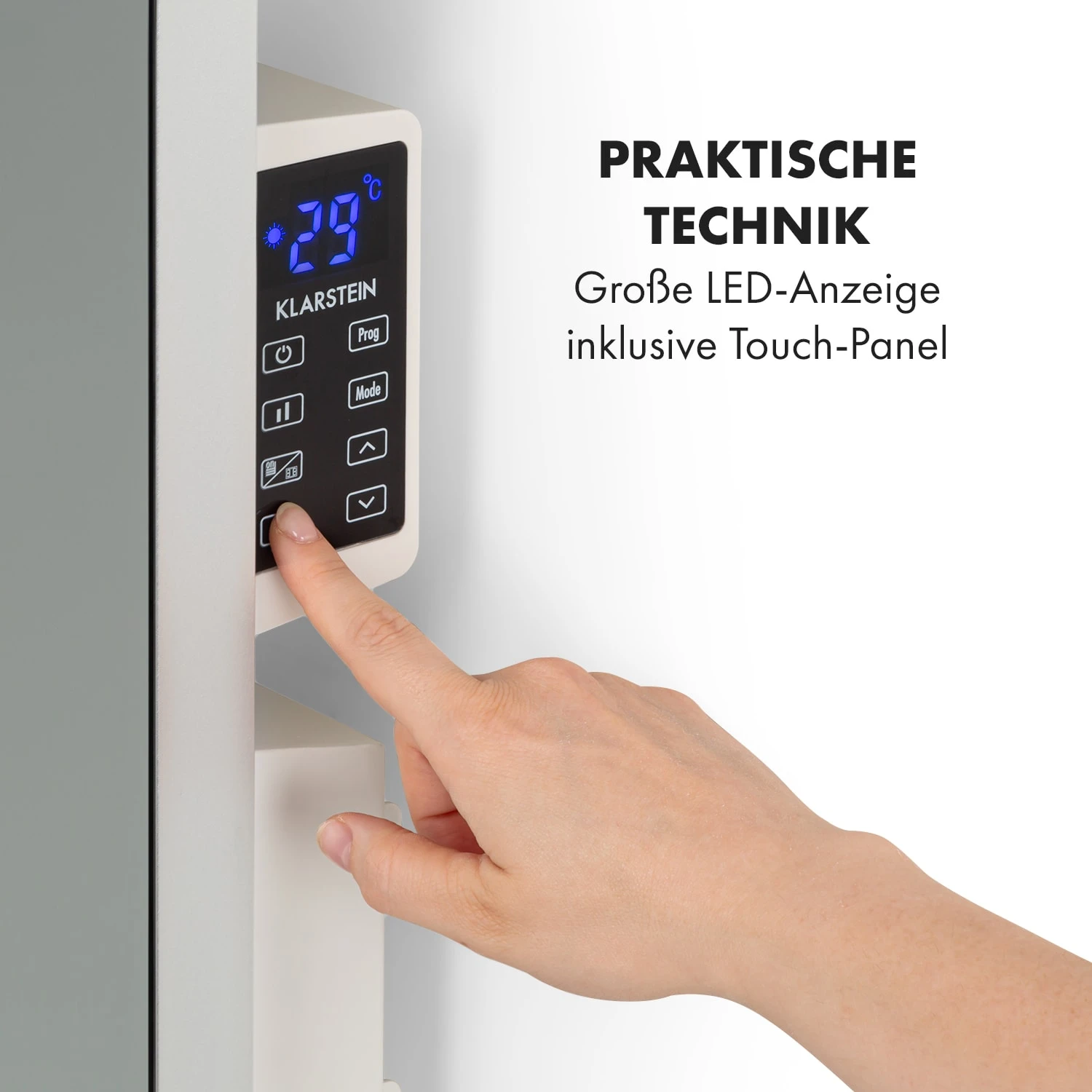 Mit Wohlfühlwärme zu purer Entspannung: Das Klarstein Hot Spot Crystal Flow Heizpanel bringt hocheffizient und platzsparend angenehme Wärme in dein Bad. Dabei versorgt es dich stets mit kuschelig warmen, trockenen Handtüchern. Die Klarstein Hot Spot Crystal Flow Wandheizung revolutioniert die Beheizung mit einer modernen Kombination aus PTC- und Infrarot-Technik. Während das PTC-Heizgerät mit zwei Leistungsstufen bei 1100 oder 1800 Watt die Luft im Bad erwärmt, sorgt ein 200 Watt starkes Infrarot-Heizelement für kuschelige Handtücher und ein angenehm warmes Gefühl auf der Haut. Doch nicht nur in Sachen Technik glänzt der Klarstein Hot Spot Crystal Flow Heizstrahler, er weiß auch mit seinem stilvollen Design zu überzeugen. Seine abgerundete Oberfläche ist komplett mit einer hitzebeständigen Spiegelfläche überzogen, die jedem Badezimmer einen Hauch von Luxus verleiht.