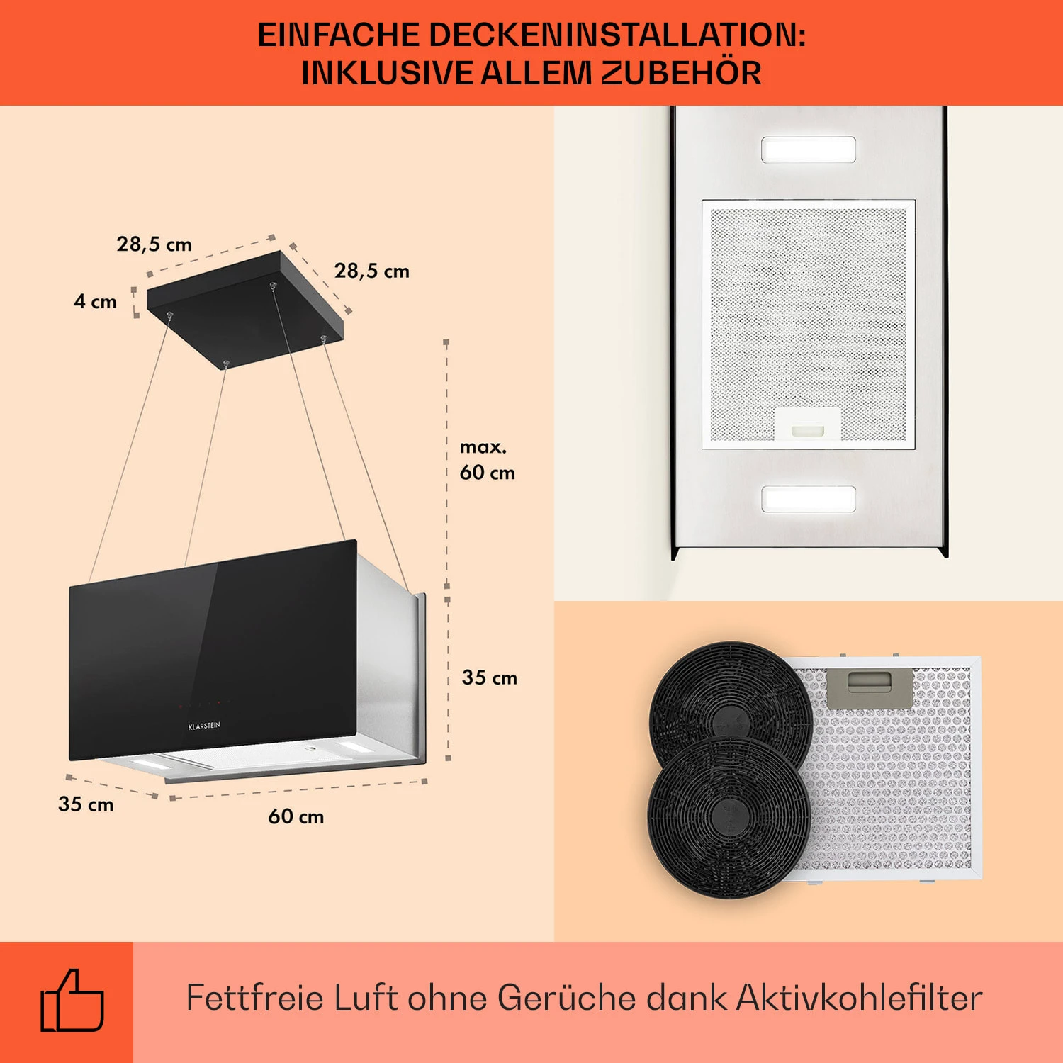 Perfektion für die Kochinsel. Mit der Klarstein Kronleuchter L Dunstabzugshaube erhalten freistehende Kochstellen den luxuriösen letzten Schliff, denn bei dieser Inselhaube ist der Name Programm. An reißfesten, 60 cm langen Stahlseilen hängt die Haube frei von der Decke und kümmert sich gelassen um entstehenden Küchendunst. In drei Leistungsstufen wälzt sie mit bis zu 590 m³/h Luftstrom den Dampf unermüdlich um und befreit so die Küchenluft von Fett und Dunst. Damit ist sie bestens für die großen Raumverhältnisse einer amerikanischen Inselküche geeignet. In allen Betriebsstufen spendet eine integrierte LED-Kochflächenbeleuchtung helles, weißes Licht, während farbige LEDs an der Touch-Steuerung genau anzeigen, welche Leistungsstufe gewählt wurde.