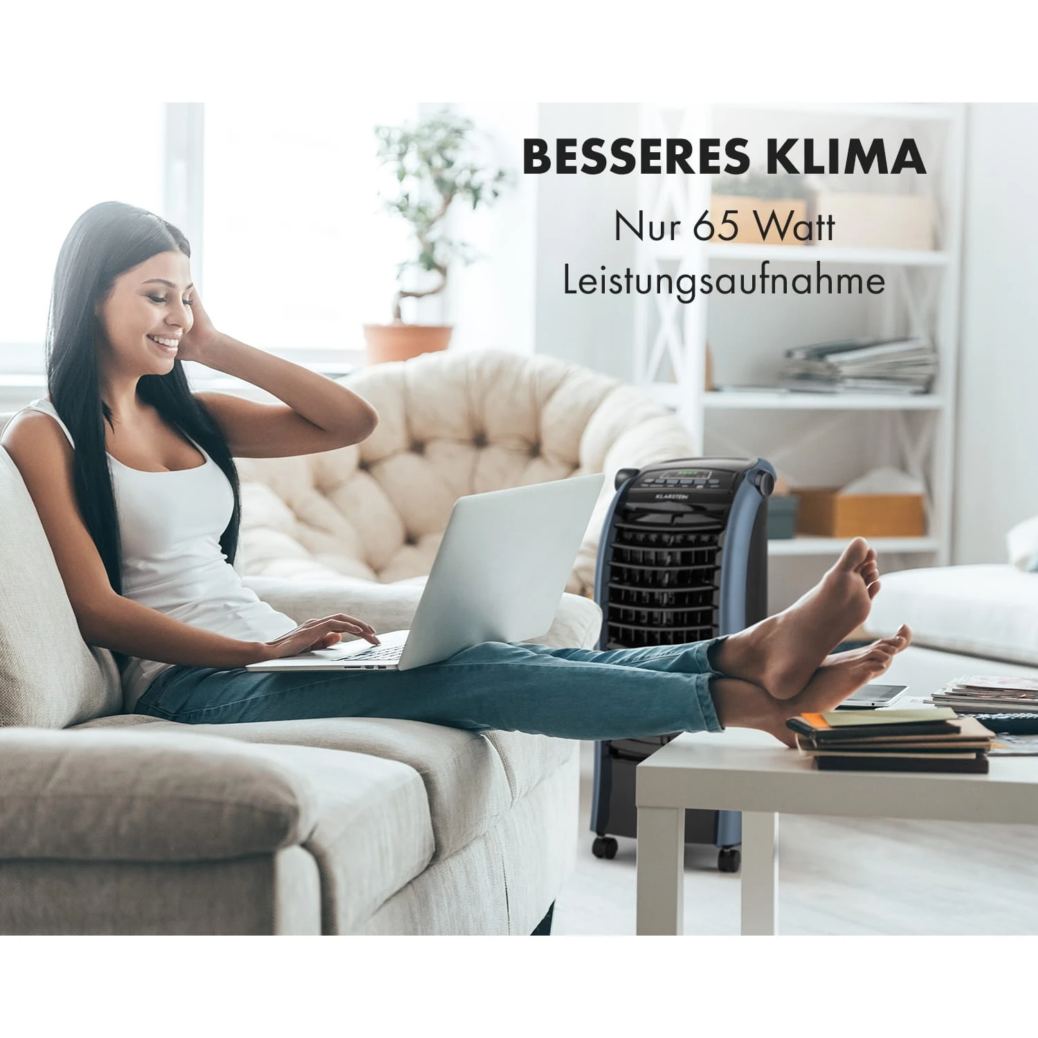 Maximale Erfrischung! Der Klarstein Maxfresh Ocean 4-in-1 Luftkühler bringt punktgenaue Abkühlung an heißen Sommertagen. Als Ventilator, Luftkühler und Luftbefeuchter in einem sorgt er überall für einen erfrischenden Luftstrom – der Nachtmodus lässt dich zudem in heißen Sommernächten friedlich schlummern. Das Besondere: Ein raffinierter Naturmodus simuliert an- und abschwellenden, echten Wind. Vier Windgeschwindigkeiten sorgen für eine individuelle Abkühlung. Der Nachtmodus lässt die Kühlung bis zur Einstellung des Betriebs langsam absinken und die Luftkühler-Funktion befeuchtet dank Wasserverdunstung die Raumluft zusätzlich. Für Extrafrische kannst du hier das Wasser im 6 Liter-Tank mit Kühlakkus nochmals kühlen. Zum einfachen Befüllen, Reinigen und Entleeren kann der Wassertank komplett entnommen werden.