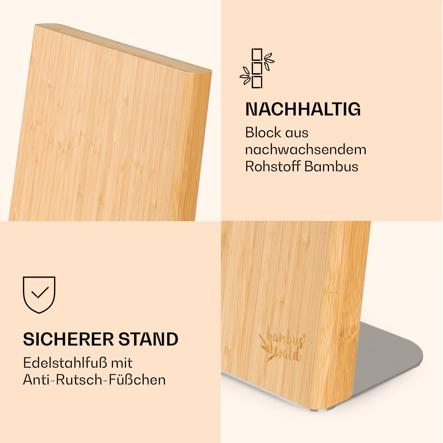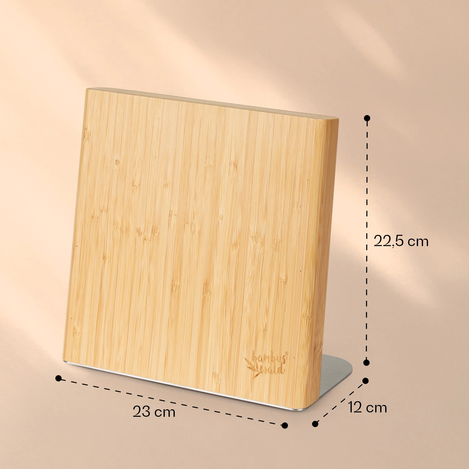 Sicher, praktisch, nachhaltig. An Klarsteins magnetischem Messerblock sind deine Messer und Küchenutensilien bestens aufbewahrt. Der Block aus Bambus mit Magnetkern erlaubt das Aufbewahren von 4 bis 6 Messern, Scheren, Schlüsseln und ähnlichem bis 20 cm Länge. Dabei kannst du die Messer ganz nach Belieben an die magnetische Front des Blocks heften. Ästhetisch ansprechend und nachhaltig präsentiert sich der Block in einer Kombination aus stabilem Bambus und rutschfestem Edelstahl-Standfuß.