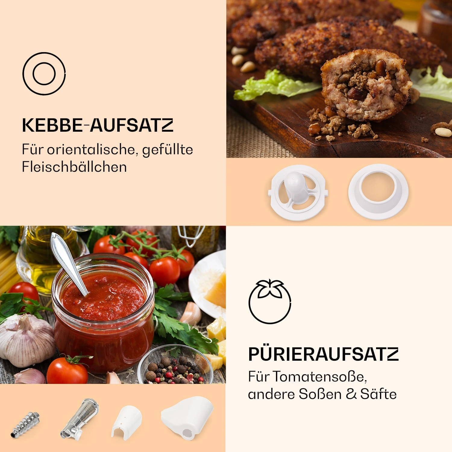 Wissen, was drin ist: Mit dem elektrischen Fleischwolf Mighty Mince von Klarstein kannst du allerlei Wurst- und Fleischspezialitäten selbst herstellen. Dies geht durch raffinierte Technik und die einfache und schnelle Befüllung von oben. Gib die entsprechenden Zutaten in die Trichterschale und schiebe sie mit dem beiliegenden Stopfer nach und nach ins Einfüllrohr, sodass sie im Kopf von Messer und Lochscheibe geformt werden. So gelingt nicht nur feines Hackfleisch in der heimischen Küche – du kannst dank dem vielfältigen Zubehör viele weitere Köstlichkeiten vor- und zubereiten. Mit dem Reibeaufsatz mit 3 verschiedenen Messern kannst du ganz unkompliziert auch Gemüse reiben.