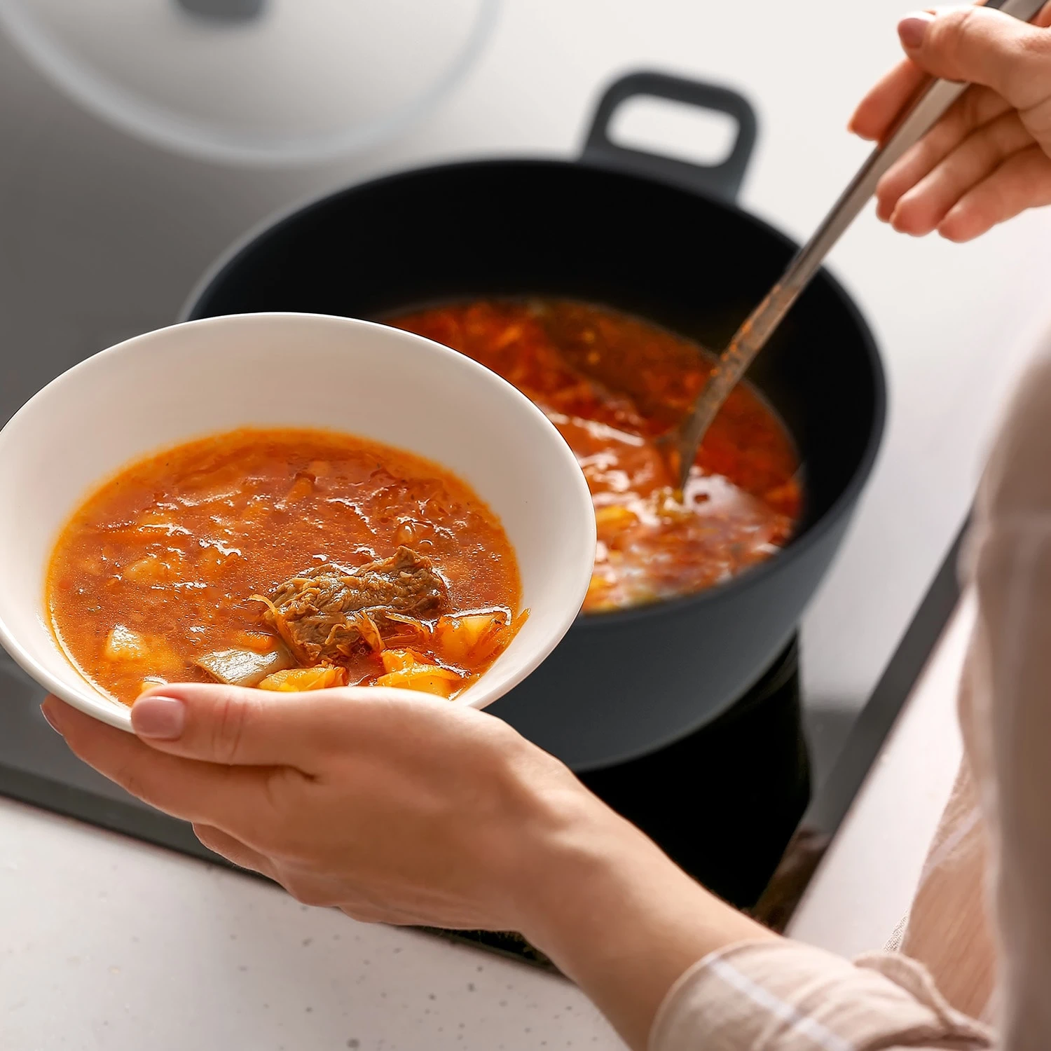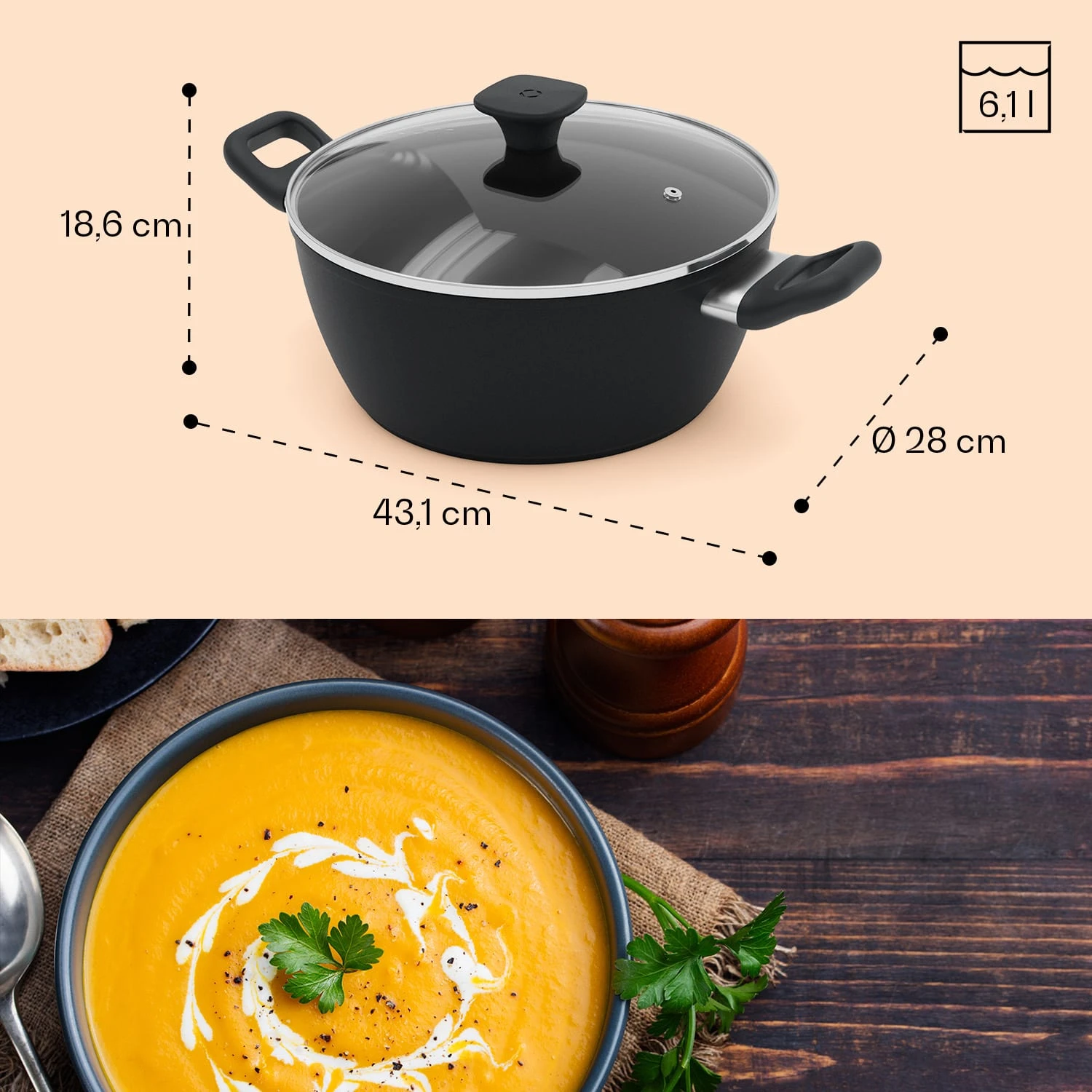 Für Abwechslung auf dem Herd – Design made in Berlin: Der Klarstein Noto Endurance Kochtopf ist dein neuer praktischer Helfer in der Küche, wenn es darum geht, Kaltes heiß zu machen. Der 28 cm durchmessende Kochtopf aus geschmiedetem Aluminium fasst bis zu 6,1 Liter und ist für alle Arten von Küchenherd von Gas bis Induktion geeignet. Bei den ergonomischen Cool-Touch-Griffen haben unsere Berliner Designer besonders auf einfaches und unkompliziertes Handling geachtet. Der passende Glasdeckel hält die Hitze im Inneren und spart so nicht nur Energie, sondern lässt Speisen auch schneller kochen. Die PTFE-Anti-Haft-Beschichtung aus Keramik ist PFAS-frei und ausgesprochen langlebig. Und natürlich ist der Klarstein Noto Endurance Kochtopf komplett Spülmaschinenfest. So macht Kochen Spaß!