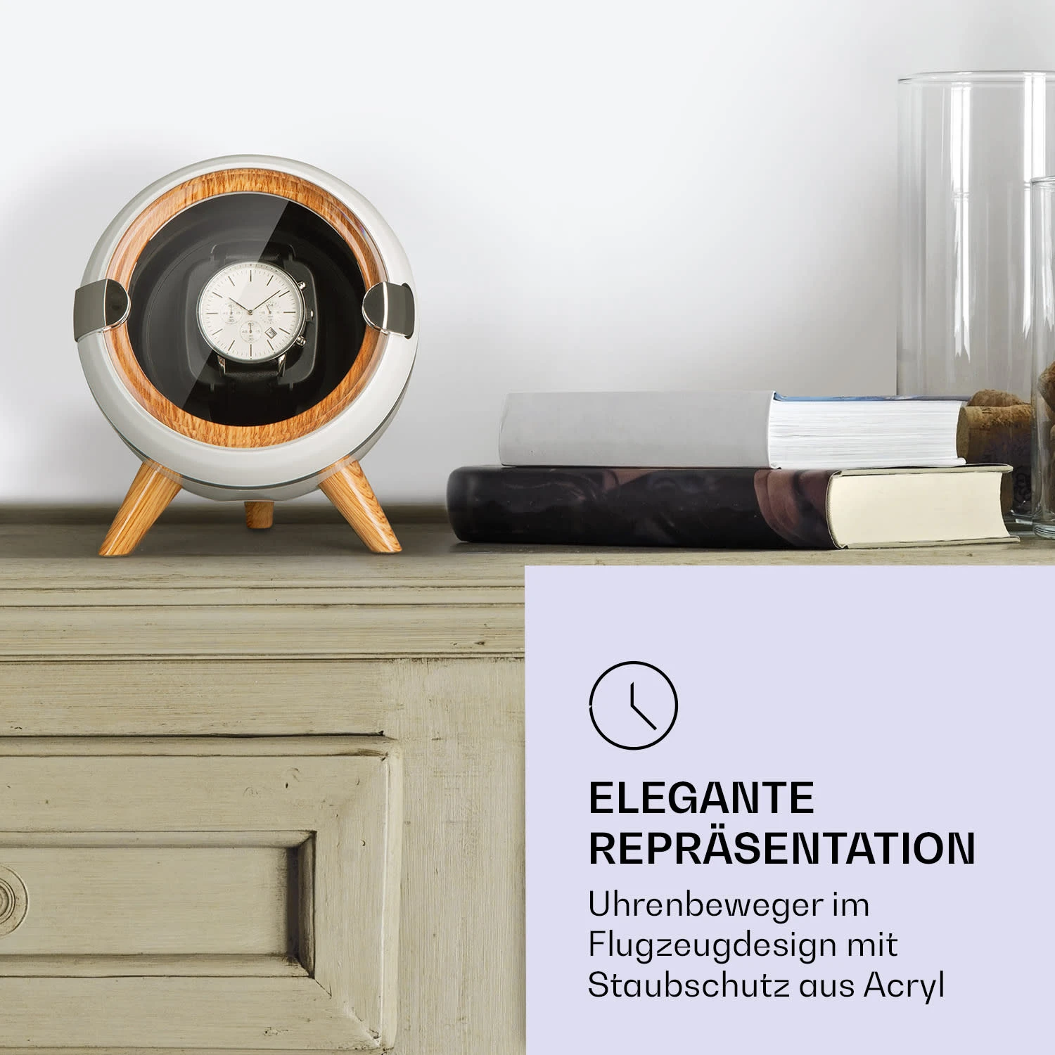 Als Uhrenaufnahme dient ein edles schwarzes Samtkissen, dass jede Uhr elegant in Szene setzt. Auch Uhren mit einem langem Band finden festen Sitz durch eine aufsteckbare Erweiterung. Eine Klarsichtabdeckung schützt den wertvollen Chronometer vor Staub und Schmutz. Zur Rotation der Uhr stehen vier Modi zur Auswahl, die sie mit unterschiedlichen Intervallen entweder links- oder rechtsherum oder in wechselnder Drehrichtung in Bewegung halten. Insgesamt kann die Uhr entweder mit 650, 900, 1200 oder 1500 Umdrehungen pro Tag rotiert werden.