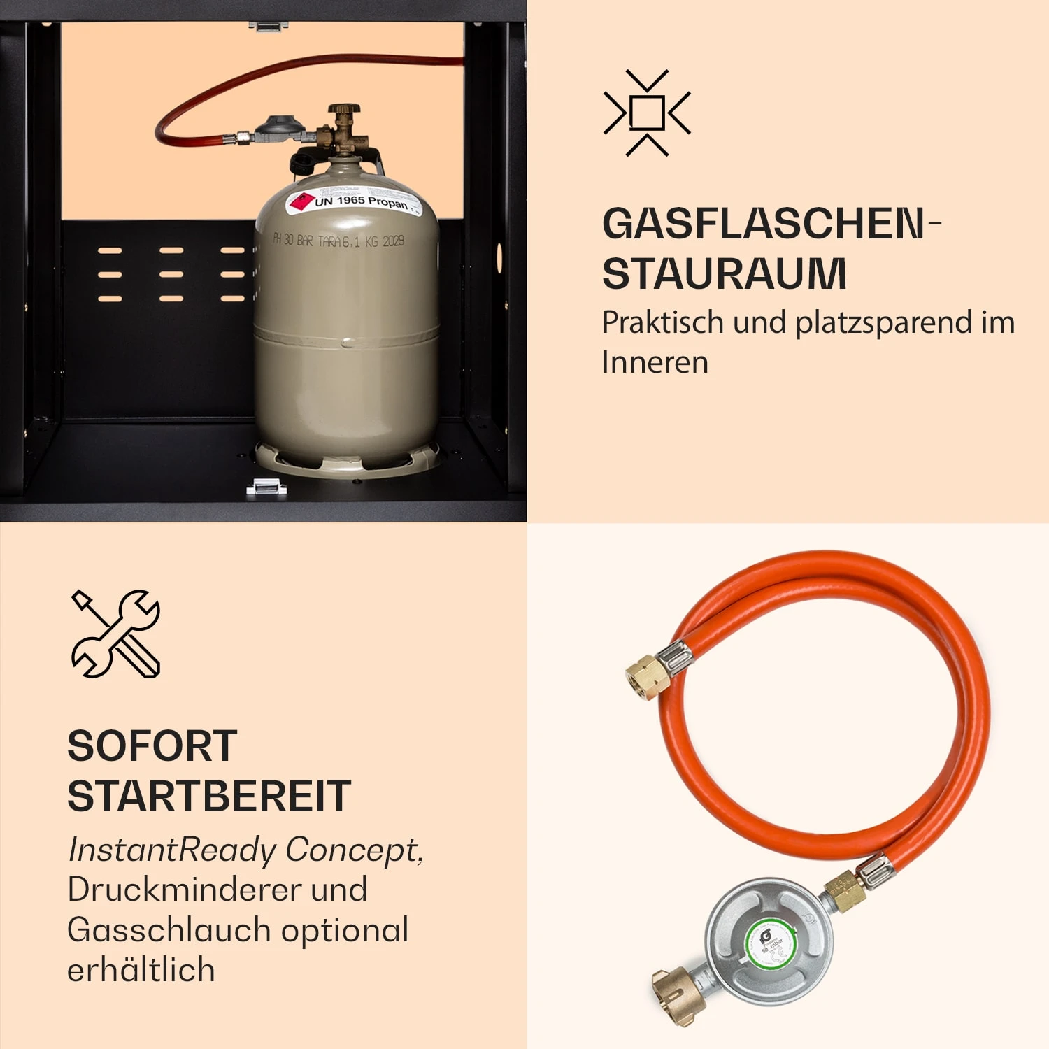 Die Grillsaison kann kommen! Kompakte Größe, beachtliche Grillfläche, starke Hitzeleistung und zeitloses Design machen den Klarstein Valdosta 4.1 Gasgrill zum Grillhelden im Garten. Vier kraftvolle Edelstahlbrenner mit jeweils 2,8 kW Hitzeleistung und ein praktischer Seitenbrenner mit 2,5 kW brutzeln Burger, Steaks, Gemüse oder Fisch in Rekordzeit. Die praktische Grillhaube mit Thermometer ermöglicht dir außerdem die Freuden des passiven Grillens von Spezialitäten wie Pulled Pork. Doch nicht nur die Leistung des Klarstein Valdosta 4.1 Gasgrills überzeugt, sein rustikales Design in Edelstahl macht dich zum Chef an der BBQ-Front.