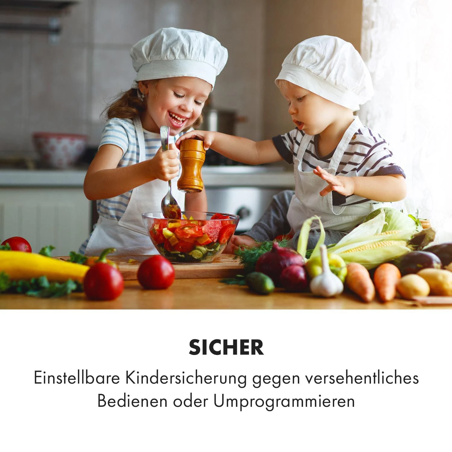Zwei Induktions-Kochflächen für Töpfe und Pfannen mit Boden-Durchmessern von 12 bis 22 cm bietet das Klarstein VariCook Neo Induktionskochfeld, die mit insgesamt 3500 W Leistung den Topfinhalten einheizen. Dabei kann die linke Platte mit bis zu 2000 W und die rechte Kochplatte mit bis zu 2000 W Leistung betrieben werden, die in jeweils 6 Stufen separat regelbar sind. Bedient wird das Glaskeramik-Kochfeld über ein integriertes SenseControl-Touch-feld samt LED-Anzeige. Neben der Einstellung der Temperatur in 20-°C-Schritten von 60 bis 240 °C kann zusätzlich in 5-Minuten-Schritten ein Timer auf Kochzeiten von 5 bis 180 Minuten programmiert werden. Nach Ablauf der eingestellten Zeit schaltet er das Kochfeld automatisch ab. Weitere Automatik-Funktionen erleichtern die Bedienung und erhöhen die Sicherheit des Kochfelds: Die Kindersicherung aktiviert eine Tastensperre, die verhindert, dass Kinder das Gerät ungewollt bedienen oder nach der Programmierung Einstellungen versehentlich verändert werden. Die automatische Topferkennung sorgt dafür, dass nur benötigte Teile der Induktionsschleife aktiviert werden, was effektiv Energie beim Kochen spart. Zusätzlich wird ein Überhitzungsschutz aktiv, sollte ein Kochfeld zu heiß werden und die Automatikabschaltung schaltet das Gerät nach 2 Stunden Nichtnutzung selbstständig aus.