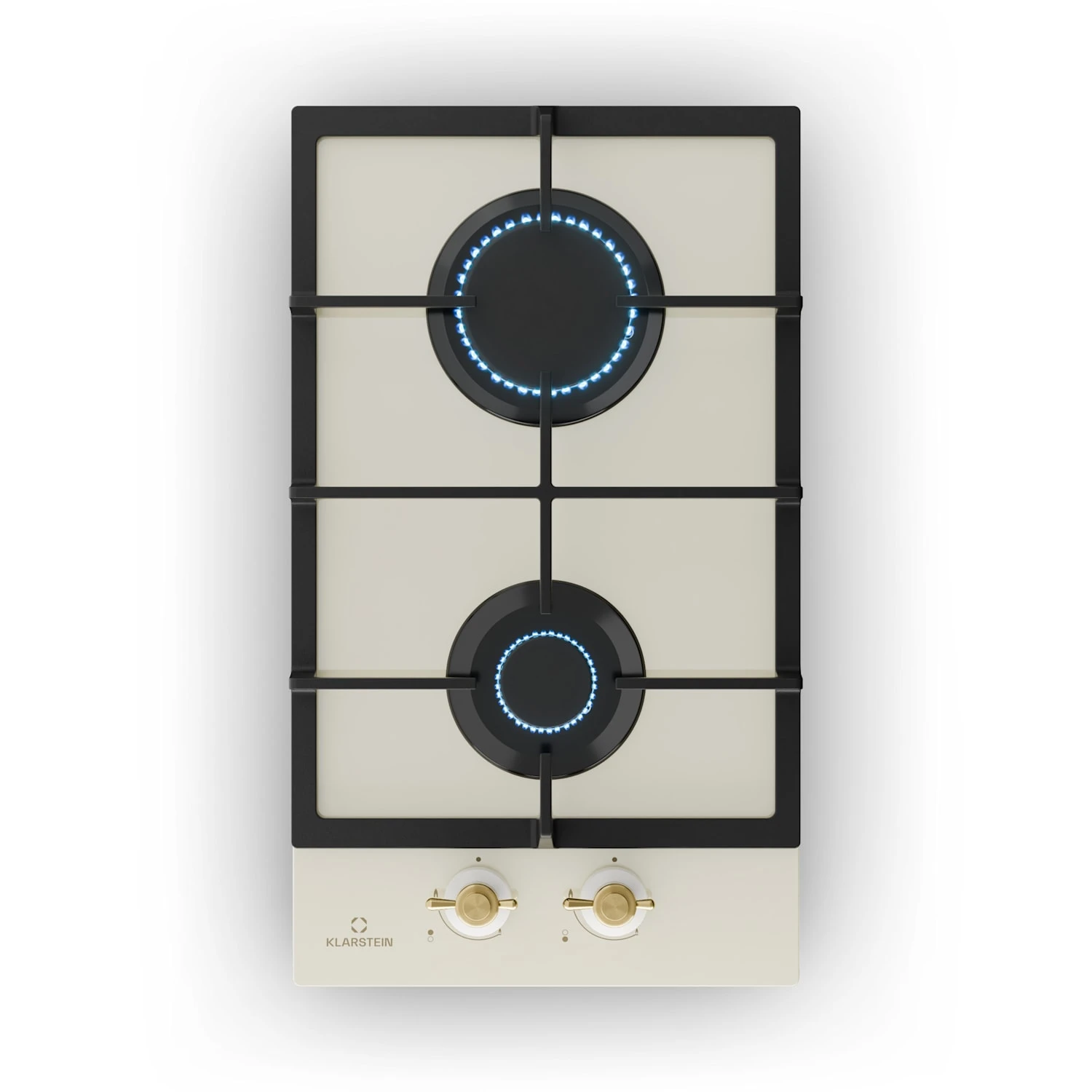 Auf dem platzsparenden Klarstein Victoria Domino Gaskochfeld befinden sich zwei hochwertige Sabaf-Brenner, die mit einer Leistung von 3 kW und 1 kW ordentlich einheizen. Die Brenner verteilen die Hitze gleichmäßig in der Mitte und an den Rändern deines Kochgeschirrs, so wird alles perfekt gegart. Die Bedienung ist dank der selbsterklärenden Symbole an den großen im Retro-Design gestalteten Drehknöpfen absolut intuitiv, die Hitzezufuhr kann während des Kochvorgangs immer wieder direkt angepasst werden. Via SnapJetIgnition entzündest du die Flamme, somit ist kein zusätzliches Feuer nötig. Das abnehmbare Kreuz aus massivem Gusseisen sitzt passgenau und kippsicher über den Flammen. Das Kochfeld ist mit einer gehärteten, pflegeleichten Keramikglas-Beschichtung versehen, die nicht nur gut aussieht, sondern auch besonders leicht zu reinigen ist.