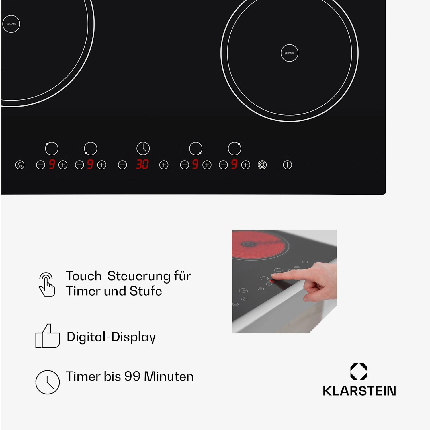 Drei Kochflächen mit Durchmessern von zweimal 16,5 cm und einmal 20 cm sowie ein Variokochfeld für Töpfe von 12 – 23 cm bietet das Virtuosa Einbaukochfeld, die mit insgesamt 6500 W Leistung die Inhalte von Töpfen und Pfannen zum Kochen bringen. Dabei können die beiden kleinen Platte jeweils mit bis zu 1200 W, die große Kochplatte mit bis zu 1800 W und die Varioplatte je nach Topfgröße mit 800, 1600 oder 2300 W Leistung betrieben werden, die in 9 Temperaturstufen separat regelbar sind. Bedient wird der Klarstein Keramikherd mit einem integrierten Touch-Sensorfeld mit Digitaldisplay, sodass keine zusätzlichen Regler und Knöpfe die Oberfläche der Küchenzeile durchbrechen. Neben der Temperatur kann für jedes Kochfeld in Minuten- oder 10-Minuten-schritten ein Timer programmiert werden, der entweder nach Ablauf der eingestellten Zeit die Kochplatte abschaltet oder ein akustisches Signal ertönen lässt.